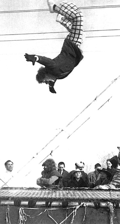 Albrecht Hurtmanns ( unten links im weißen Trikot ) mit dem fahrbaren Trampolin des „Zirkus Germania“ beim Rosenmontagsumzug 1964 in Süchteln |