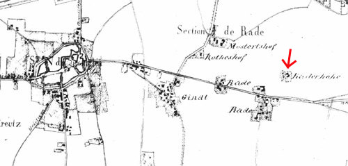 Karte von Süchteln mit der südlich gelegenen Sektion Rade von 1812 ( Der Pfeil markiert den Standort der Kirche auf der “Raderhöhe” ) |
