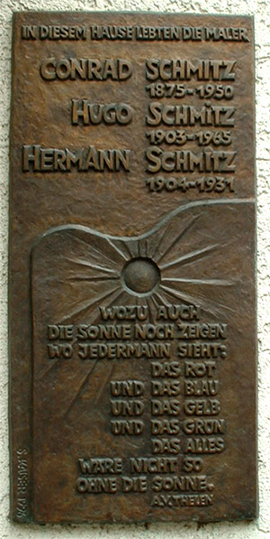 Hugo Schmitz 30.01.1903 - 17.01.1965 Verließ 1924 das elterliche Geschäft auf der Krefelder Straße 4 ( heute Tönisvorsterstr. 4 ), um in München an der Kunstakademie zu studieren. 1930 verschlug es ihn nach Korntal bei Stuttgart, wo er als „schwäbischer Heimatmaler“ eine zweite Heimat fand. Nach dem Zweiten Weltkrieg erlebte er durch zahlreiche Ausstellungen und Verkäufe seiner Bilder Anerkennung und Erfolg. Virtuos gemalte Portraits, farbenreiche Bilder von einer Reise in die Türkei und nicht zuletzt viel beachtete Landschaftsbilder aus dem Tessin begründeten seinen Ruhm, aber auch Landschaftsbilder vom Niederrhein, den er bei Urlauben in seiner alten Heimat Süchteln wiederentdeckte. |