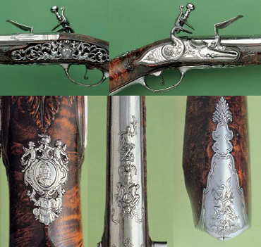 Diese Steinschloss-Vogelflinte wurde von Armand Bongarde ( ab 1678 in Düsseldorf tätig - gestorben 1727 ), einem der besten Waffenhersteller Deutschlands um etwa 1710 hergestellt. Charakteristisch für Bongardes Stil sind die detailliert ziselierten Stahlsockel-Schlossplatte, Seitenplatte, Schild, Gewehrlauf und obere Verlängerung der Schulterstütze, die Waffentrophäen, gefesselte Gefangene, Figuren mit Trompeten und einen mit Lorbeer gekrönten Krieger ( Symbol des Sieges und Ruhmes ) beinhalten. |