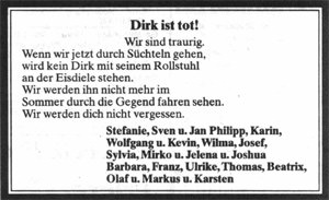 wenige, die damals meinten, daß er in ein paar Wochen wieder zurück wäre in der Klinik. Er belehrte sie alle eines Besseren und bis zuletzt war er auf das Erreichte mit Recht sehr stolz. Von da an lebte Dirk sein Leben, soweit
